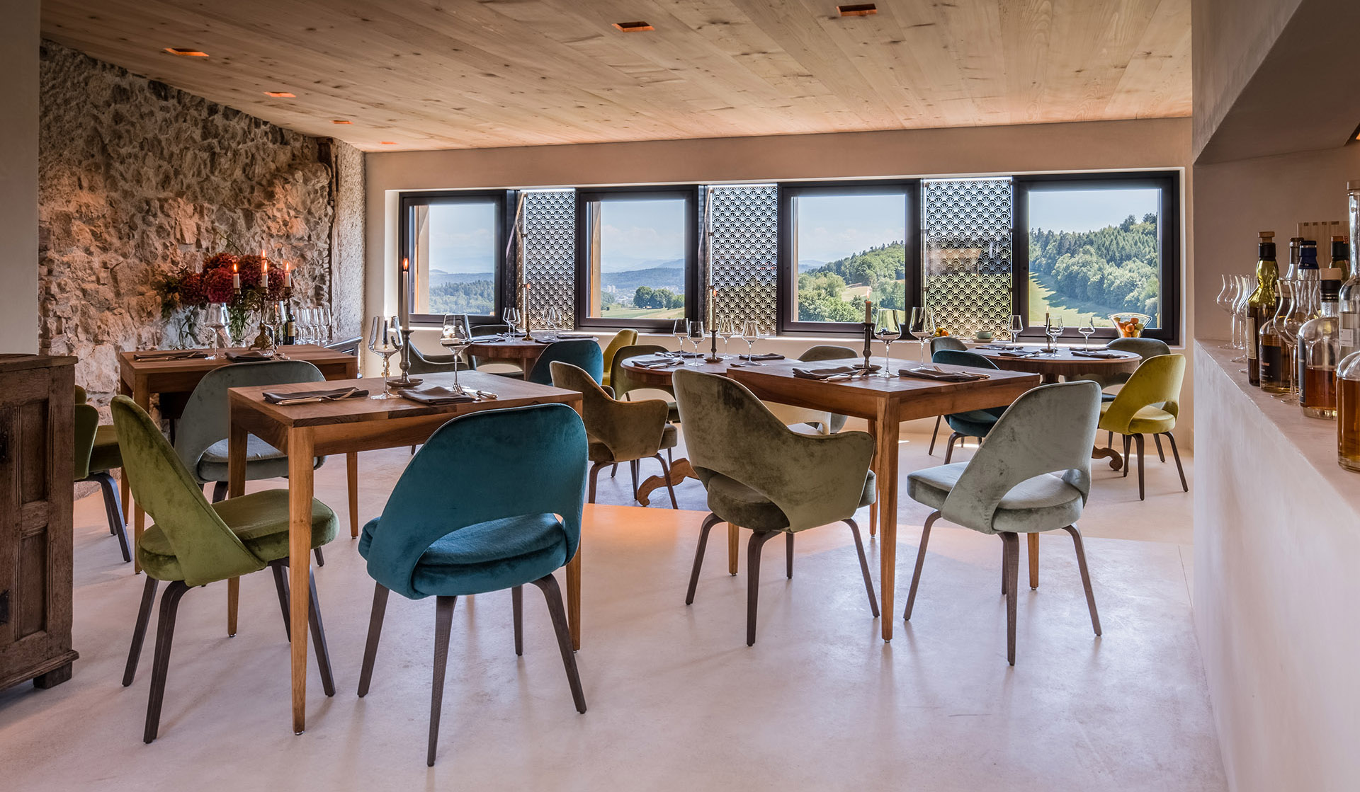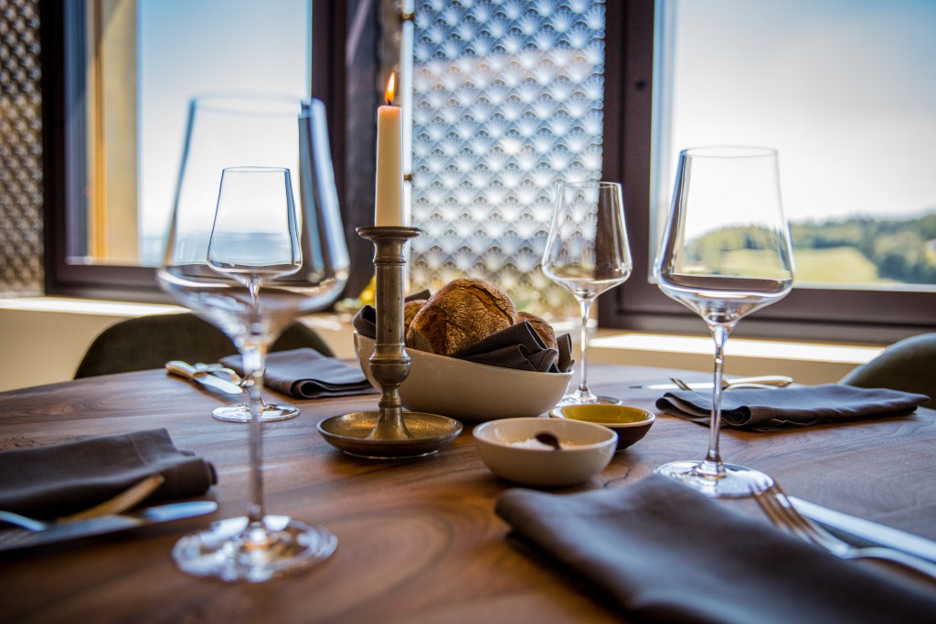 Pas de doute : on est ici dans un lieu vraiment exceptionnel. Des siècles d’histoire mouvementée contemplent les vieux murs du château, Krone, du 13e siècle, qui trône au milieu du petit village médiéval de Regensberg, entouré de vignobles. Aujourd’hui, on peut y passer la nuit dans le calme et la détente, mais aussi y manger bien et très agréablement. Tout cela grâce à l’hôte engagé et maître du château Pascal Gloser. Le restaurant gastronomique Krone Regensberg se présente avec beaucoup de goût et d’élégance, où l’on a très consciemment et très bien réussi à combiner le flair historique avec le style moderne. Mais la magnifique terrasse offre également une vue grandiose et étendue. L’agréable espace lounge qui s’y trouve invite à prendre un apéritif raffiné ou à boire un verre après un repas savoureux.