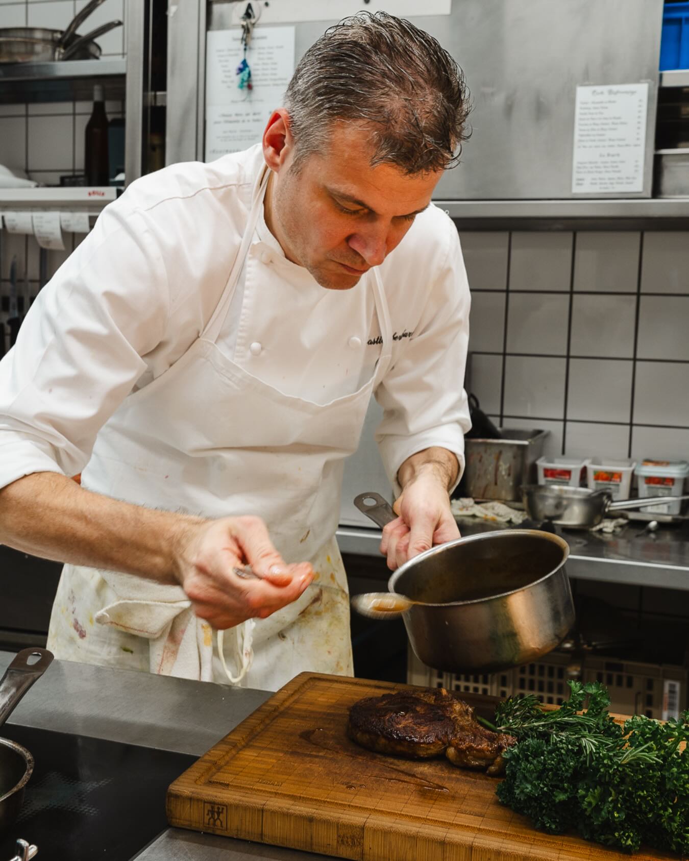 A La Table des Suter, il y a Jane-Lise qui sait parfaitement mettre en valeur le travail des vignerons romands et faire partager ses choix avisés. Quant à son mari Pierrick, il régale ses clients avec des plats qui lui ressemblent : généreux, sans chichi mais avec du caractère. Pour s’en convaincre, il suffit de choisir un des menus préparés par le chef et sa brigade au gré des produits et saveurs du moment.